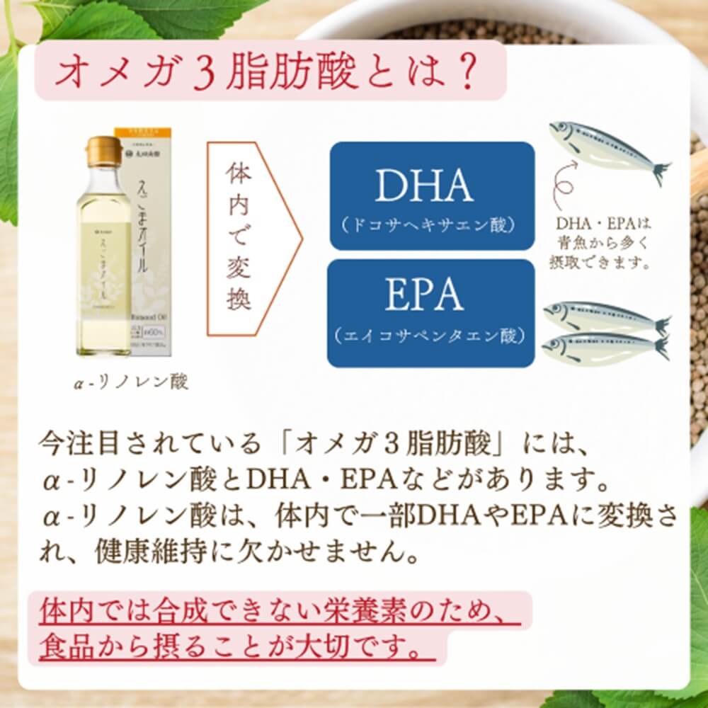 日本人に不足しがちなオメガ3脂肪酸(α-リノレン酸)を約60%含有。しそ科の植物、えごま種子を昔ながらの圧搾製法で搾った油です。現代人に不足しがちなオメガ3脂肪酸(α-リノレン酸)を効率よく摂取でき、健康生活をお手伝いする油です。マルタのこだわりの精製技術で、えごまオイルをより食べやすく!クセがなく、さっぱりとした味わいのため、料理の味を邪魔しません。また、少量ずつ出るキャップを使用しているので、一気に油が出てきません。1日小さじ1杯を目安に、ドレッシングやお味噌汁に入れてお召し上がりください。