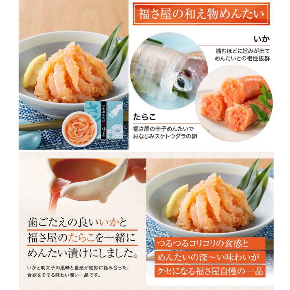 ◎いか明太:いかと辛子めんたいを和えた福さ屋の定番商品!いかの食感と辛子めんたいのピリッとした食感がうまく調和した一品です。