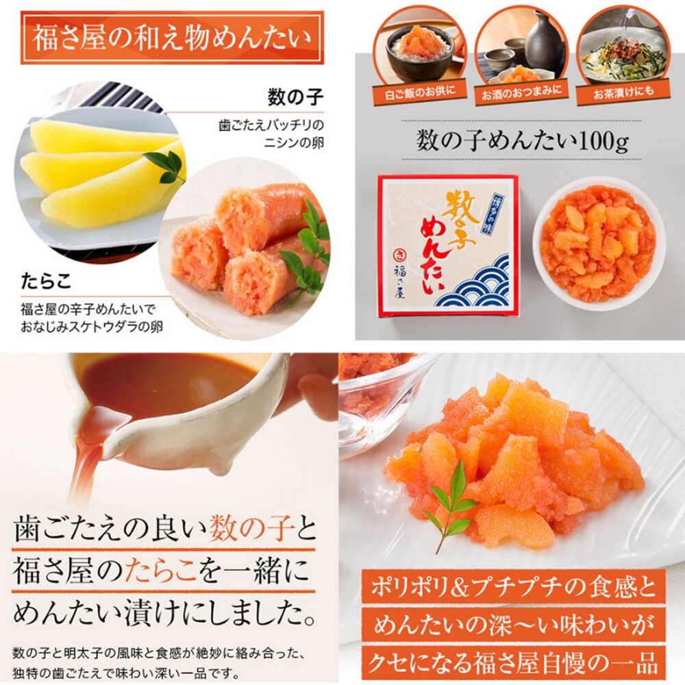 ◎数の子明太:歯ごたえバッチリのニシンの卵「数の子」と、福さ屋の辛子めんたいでおなじみのスケトウダラの卵「たらこ」を同時に、福さ屋辛子めんたい漬にしました。数の子と明太子の風味と食感が絶妙に絡み合った、独特の歯ごたえで味わい深い一品です。